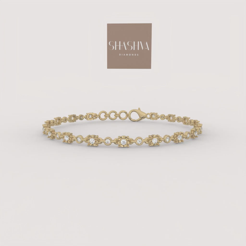 This delightful Daisy Chain Bracelet features brilliant round diamonds nestled within intricate, floral-inspired gold settings, evoking a field of delicate blossoms. A charming and utterly feminine piece, it offers continuous, gentle shimmer that captures the romance of nature.