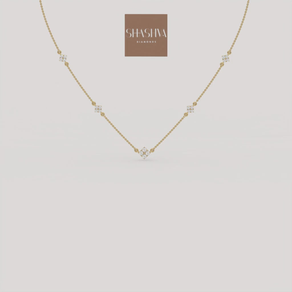 Brilliant, diamond-set square clusters are scattered along a delicate chain, charting a sophisticated and shimmering cosmic path. This supremely feminine necklace offers a versatile, ethereal sparkle, symbolizing light and guidance with quiet luxury.
