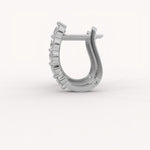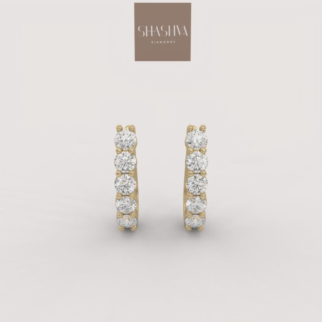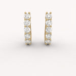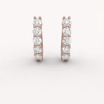 The Eclat Hoops are sleek, close-fitting earrings that showcase brilliant round diamonds set vertically in a shared prong or basket setting for maximum light exposure. Their pure, dazzling sparkle offers clean, modern elegance perfect for everyday luxury.