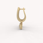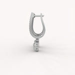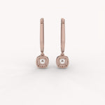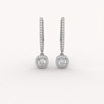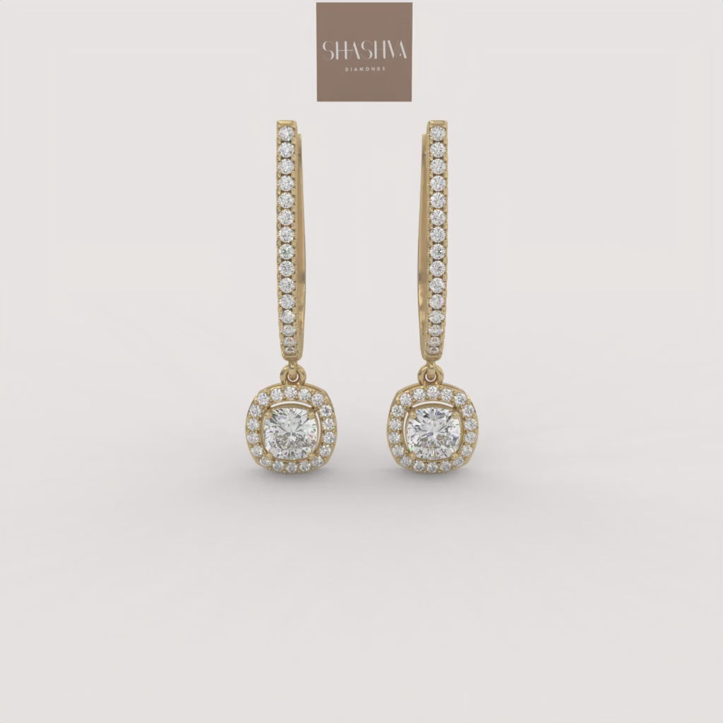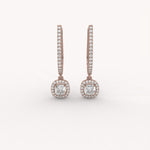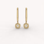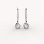 The Cushion Hoops feature a slender hoop accented with closely-set diamonds, suspending a dimensional square-cut diamond drop. The focal stone is encircled by a border of accent diamonds, creating a rich texture and graceful movement.