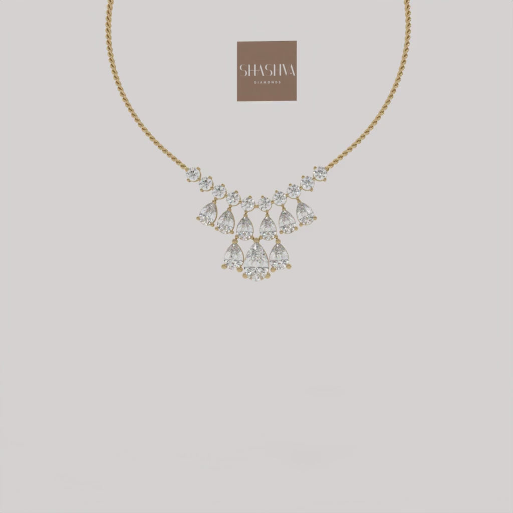 A breathtaking arrangement of pear-shaped diamonds descends in tiered brilliance, creating a dazzling, light-catching spectacle. This supremely glamorous necklace offers magnificent movement and unparalleled feminine class for grand occasions.