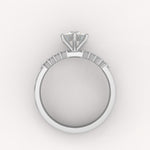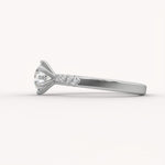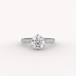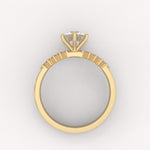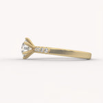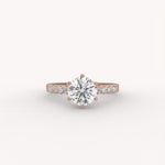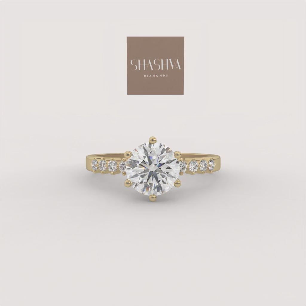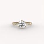 The Jeweled Solitaire Ring is an elevated classic, featuring a magnificent brilliant round diamond secured in a timeless six-prong setting. The elegance is enhanced by a refined line of accent diamonds set into the shoulders of the polished gold band, delivering graceful depth and texture.