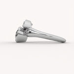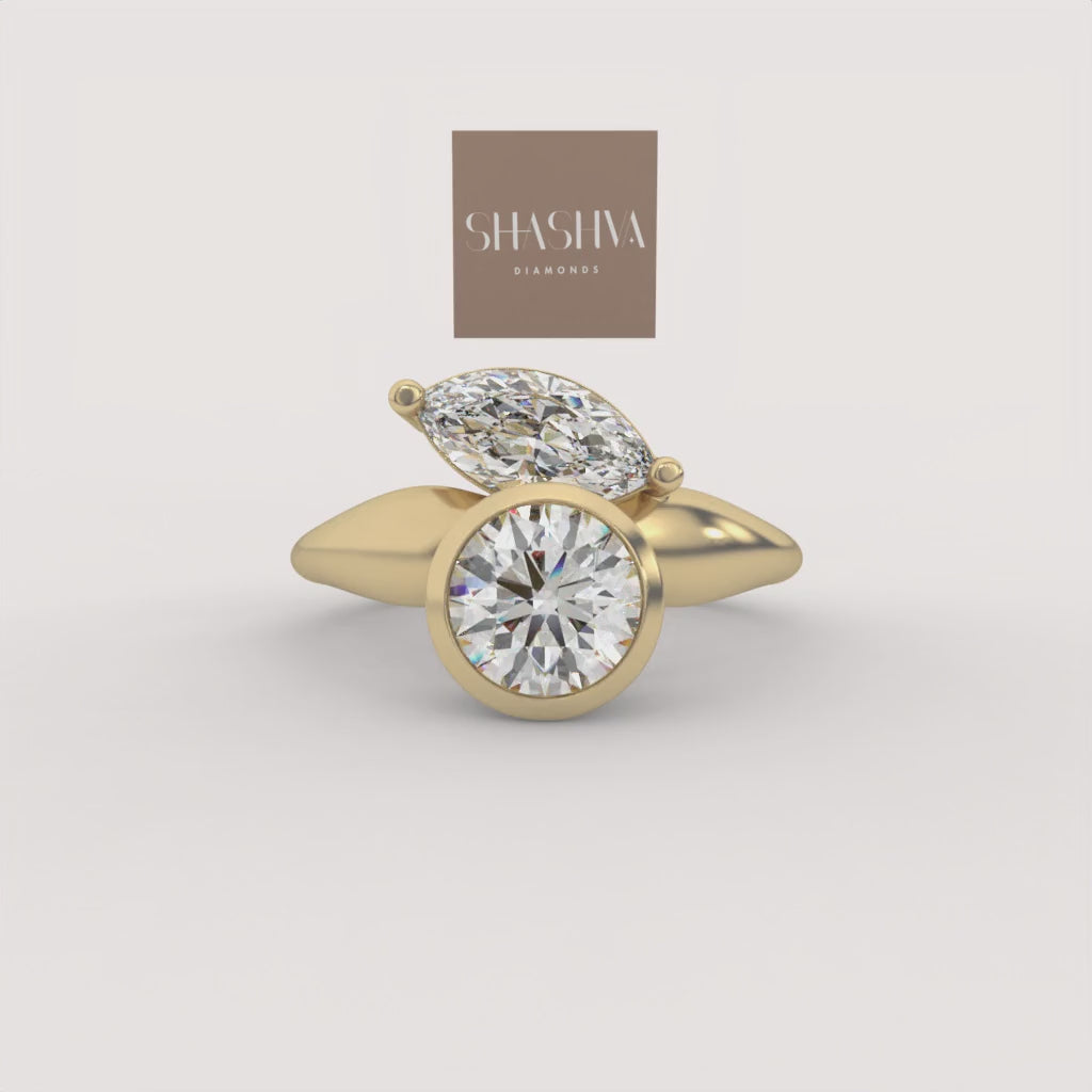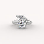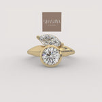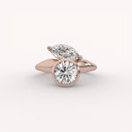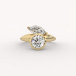The Bezel Bloom Ring is a sculptural, modern two-stone design featuring a brilliant round diamond in a bezel setting. A marquise-cut diamond is thoughtfully placed beside it, creating an asymmetric, organic arrangement set on a sleek, flowing gold band.