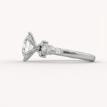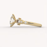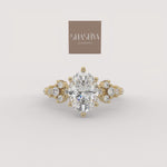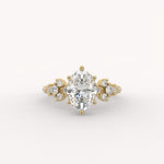The Nebula Ring showcases a bold oval diamond centerpiece, dramatically framed by organic clusters of round accent stones extending along the band. This high-impact design creates a dimensional, starburst-like effect that feels vibrant and magnificent.