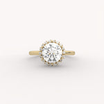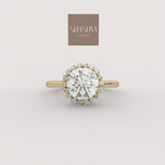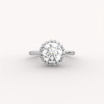 The Heirloom Bloom Ring is a romantic design starring a magnificent brilliant round diamond. This centerpiece is beautifully framed by a detailed halo where each accent diamond is individually set, creating a delicate, petaled outline and an air of vintage elegance.