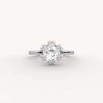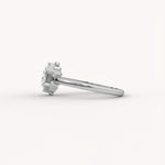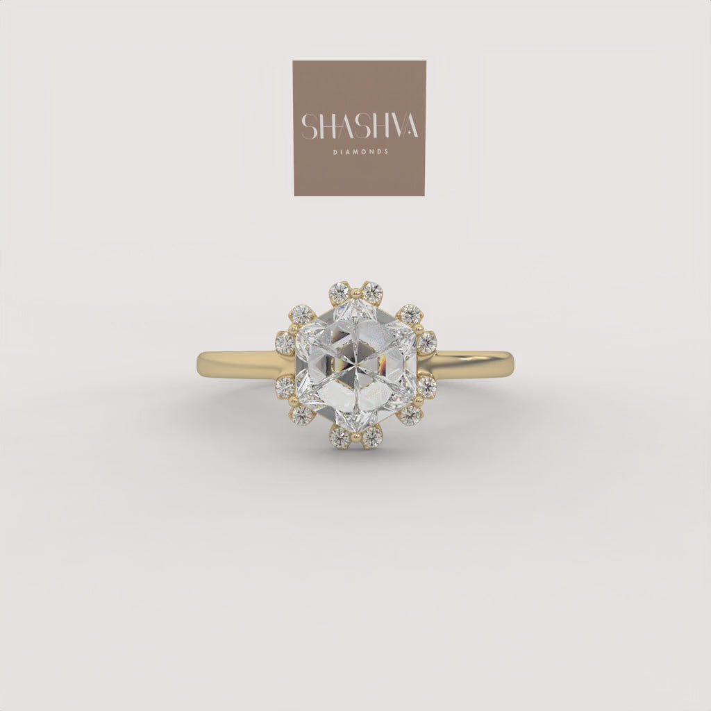 The Opus Ring is a masterful work of geometric design, starring a rare hexagon-cut diamond as its centerpiece. The striking form is accentuated by a halo of individually set round diamonds, which highlight the precise, six-sided symmetry of the central stone.