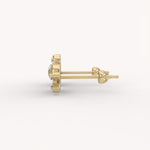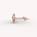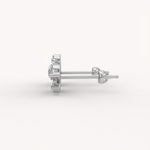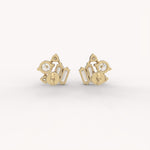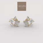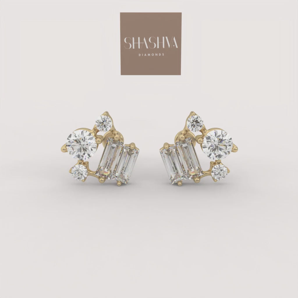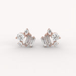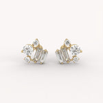 The Spark Studs are a striking asymmetrical design featuring a bold cluster of brilliant round diamonds mixed with sharp, elongated baguette-cut stones. This sophisticated explosion of light and form creates a modern, high-intensity shimmer at the ear.