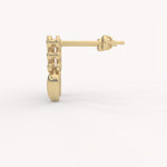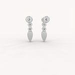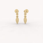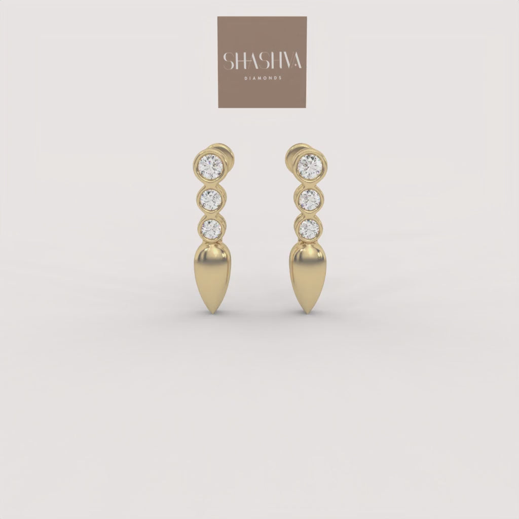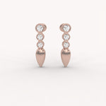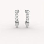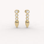 The Rivulet Drops are a modern, streamlined design featuring a delicate cascade of three bezel-set brilliant round diamonds. The line flows gracefully into a polished gold teardrop base, creating a pure, bright drop of light and movement.