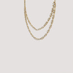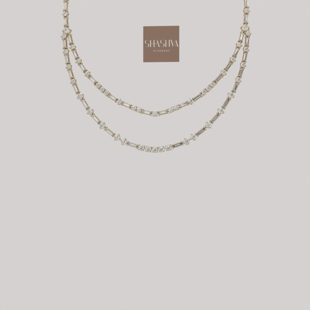 A spectacular double-strand necklace featuring a harmonious duet of brilliant round and architectural baguette-cut diamonds. This glamorous, layered piece offers feminine sophistication and a high-fashion statement of unparalleled texture and light.
