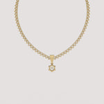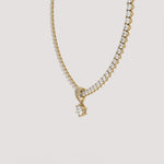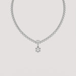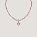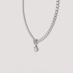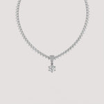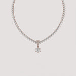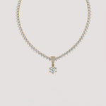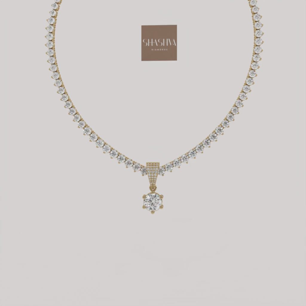 A continuous diamond tennis chain culminates in a magnificent, single brilliant-cut diamond pendant with a sophisticated pave bail. This supremely classy necklace is the ultimate feminine signature statement, combining timeless elegance with focal, radiant beauty.