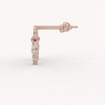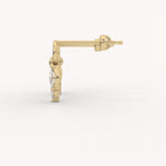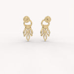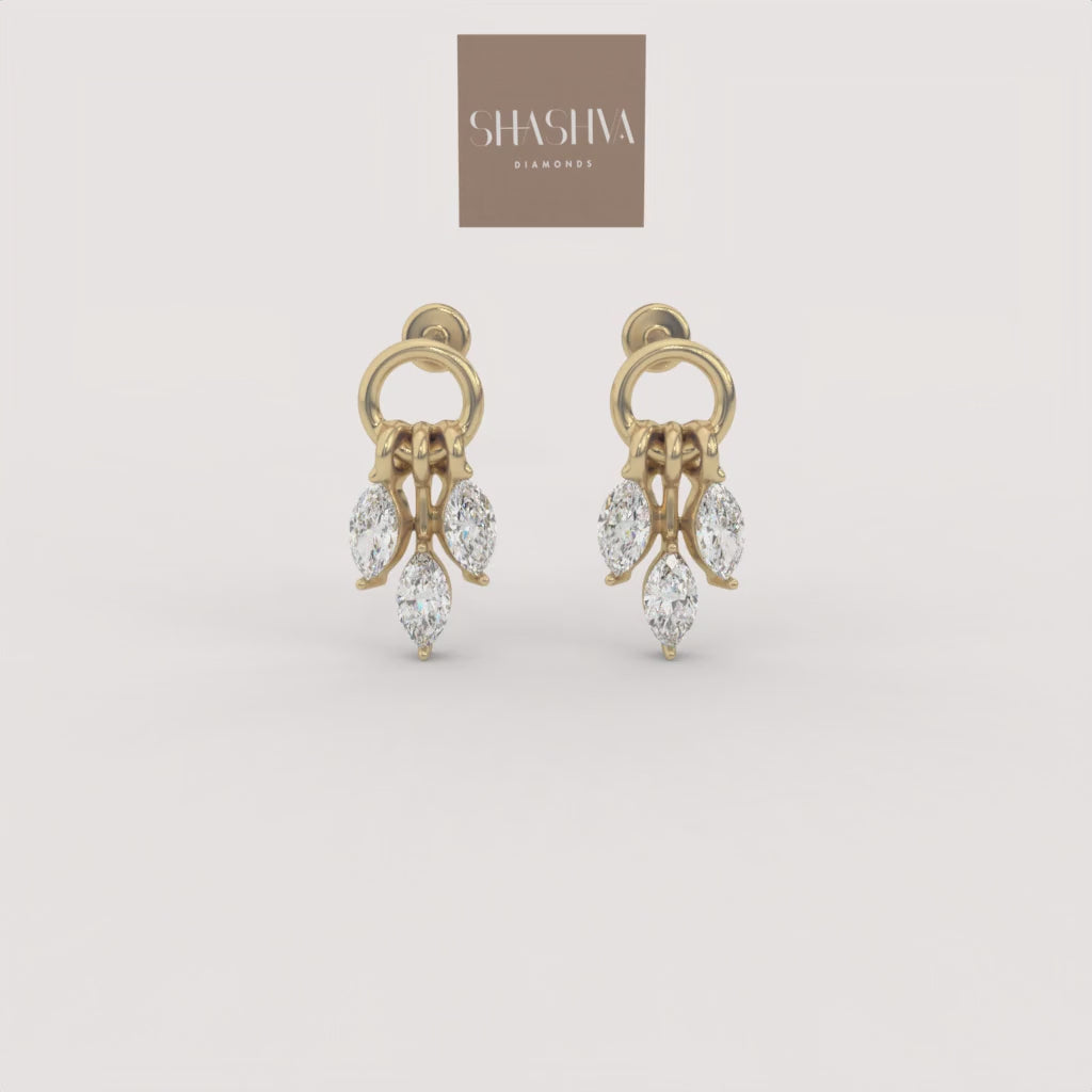 The Trine Charms are graceful drop earrings featuring three brilliant marquise diamonds suspended from a simple gold ring, creating a lively, geometric cluster. This unique, delicate design offers continuous movement and a bright, sophisticated flash of light.