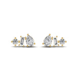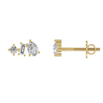 The Trinity Earrings are an artistic celebration of diamond brilliance and modern geometry. Three distinct cuts—Round, Baguette, and Pear—cluster together in polished yellow gold, creating a sophisticated and unique stud.
