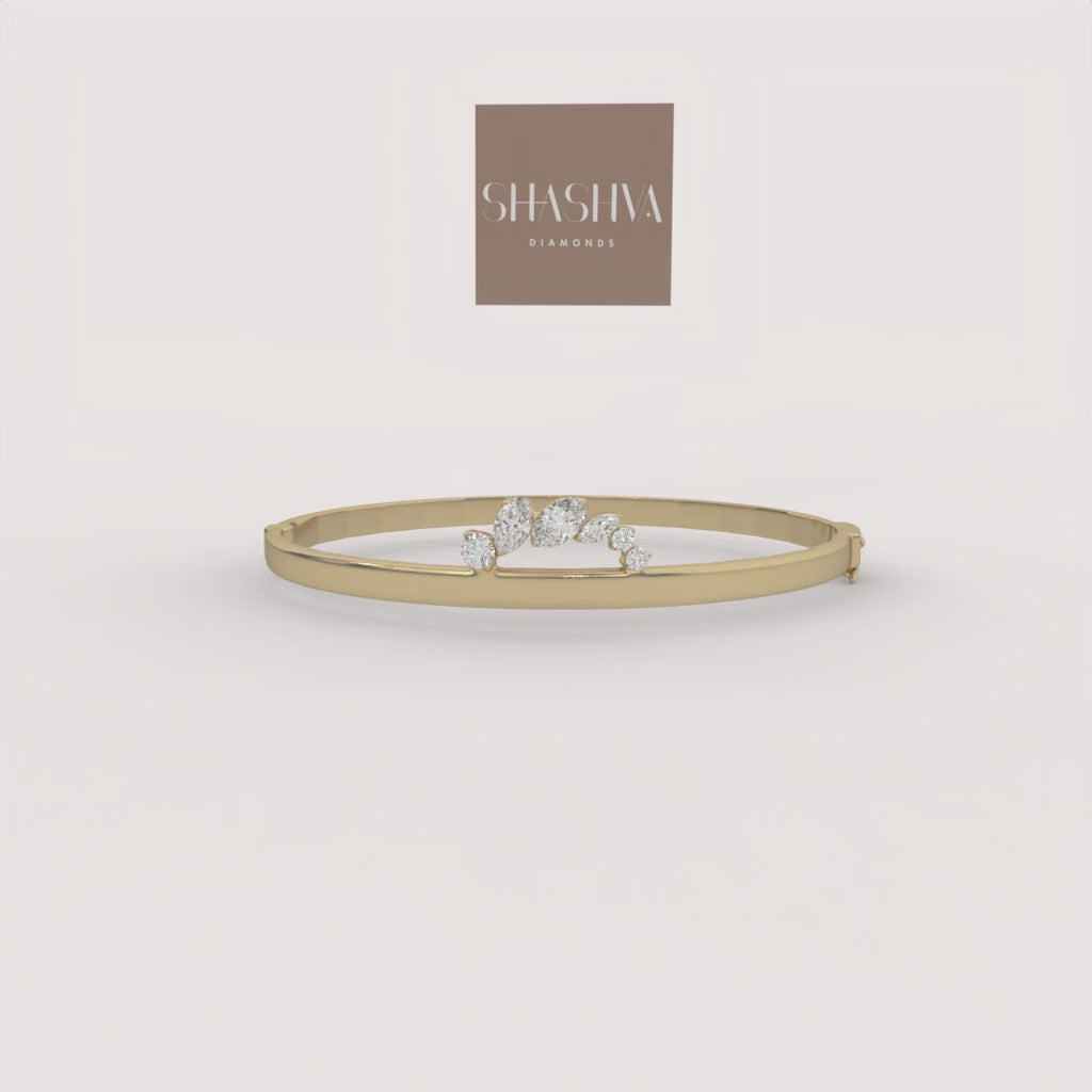 The Stella Arch Bracelet is a sleek, minimalist bracelet featuring a dramatic, open-arch cluster of mixed-cut diamonds at its center. This modern statement piece offers asymmetrical elegance, with a brilliant crescent of light designed to beautifully frame the wrist.