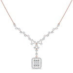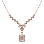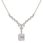 A majestic V-style drop featuring an intricate flow of brilliant diamond clusters that culminates in a striking, baguette-set, halo-bordered pendant. This opulent piece delivers a dignified and unforgettable statement of luxury.