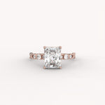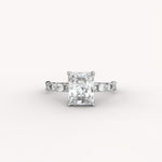 The Regal Bar is characterized by its powerful symmetry, presenting a centerpiece radiant-cut diamond secured in a meticulous prong setting. The central stone is anchored by precise trios of round diamonds set into the shoulders, establishing an impressive, multi-layered visual structure.