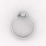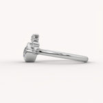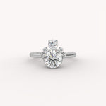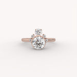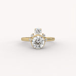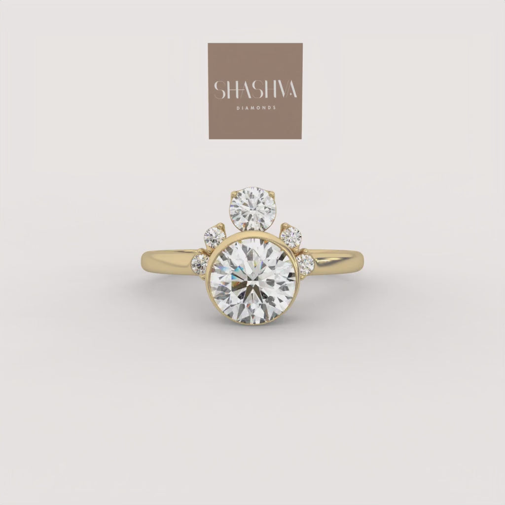 The Sovereign Ring is a bold, modern interpretation of a crown design, featuring a central brilliant round diamond secured in a smooth bezel setting. The top of the setting is dramatically layered with a smaller diamond and an arc of accent stones, creating a tiered, regal profile.