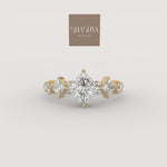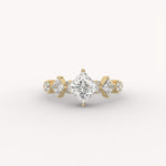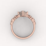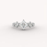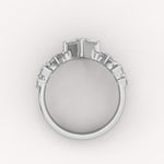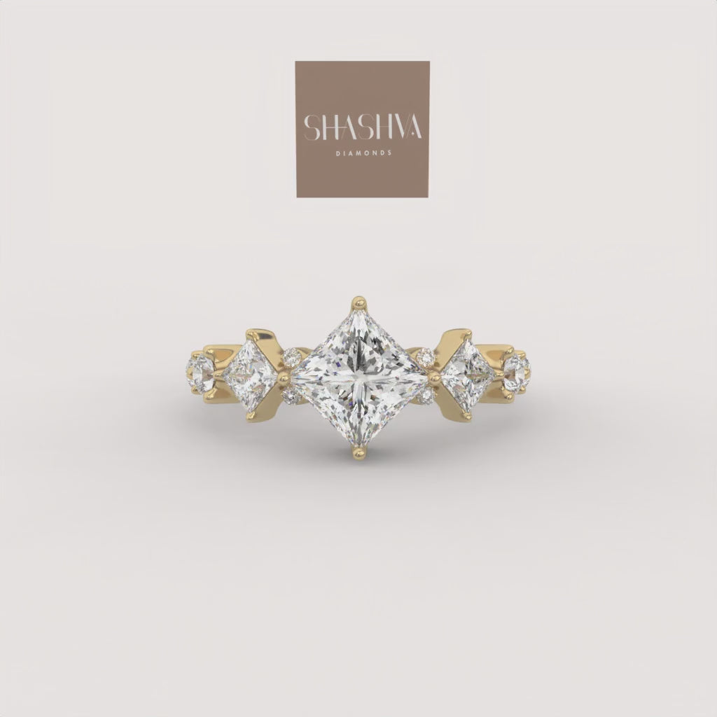 The Vesper Ring is an artful celebration of brilliance, with a sophisticated princess-cut diamond floating delicately at its center. The graceful silhouette is enhanced by the subtle, radiating elegance of the angular and round accent diamonds, giving the piece a feminine, shimmering complexity.