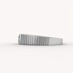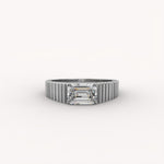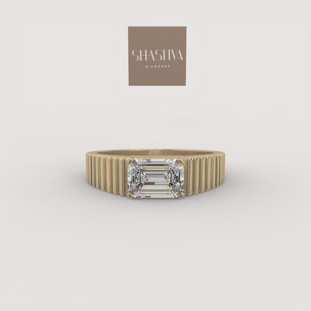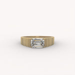 Featuring a magnificent emerald-cut diamond, securely nested in a bold, ribbed setting of polished gold. This iconic design merges Art Deco geometry with modern confidence, creating a statement of enduring power.