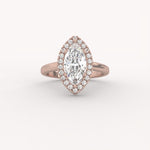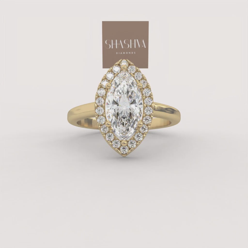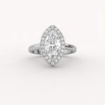 A spectacular marquise-cut diamond, renowned for its flattering, elongated shape, is encircled by a sparkling diamond halo. This vintage-inspired piece offers exceptional visual presence and a truly sophisticated, feminine elegance.